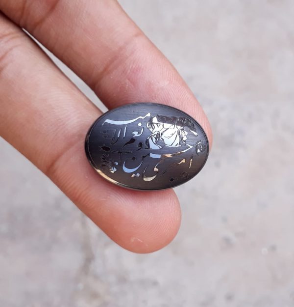 This beautiful Hematite Cabochon Gem is  30x22mm and comprised of natural Hematite, widely known as Hadeed Cheeni in Islamic culture. Engraved with traditional Islamic verses, this gem possesses restorative properties and a captivating beauty. Add it to your collection to benefit from the spiritual and healing power of hematite.