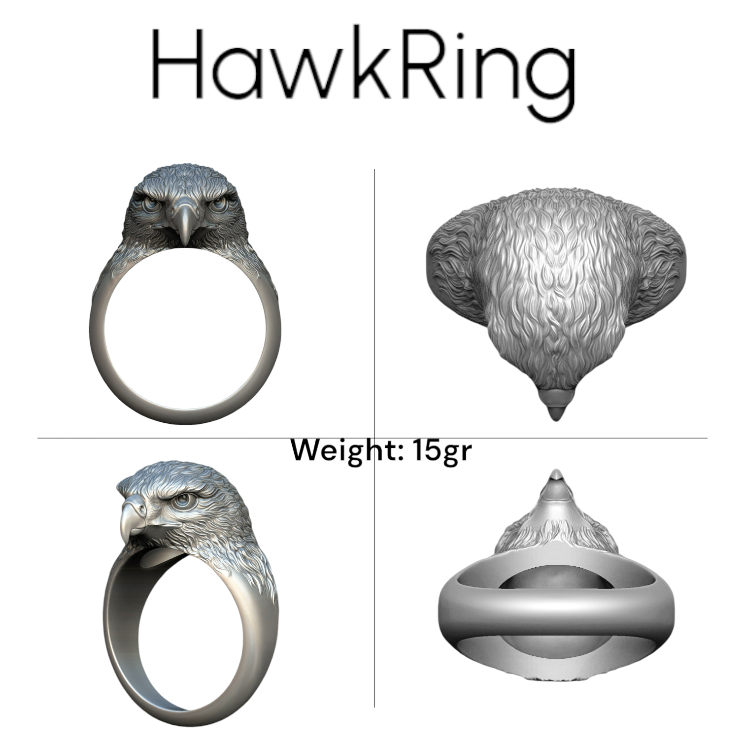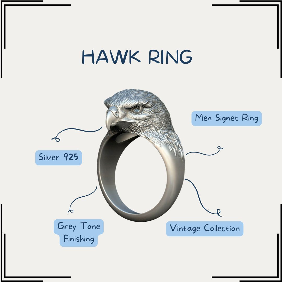 At the heart of the ring is a striking hawk emblem, symbolizing power, vision, and freedom. The signet-style design evokes a sense of heritage, while the grey-tone finish adds a contemporary touch, giving the ring a unique, antique-inspired aesthetic.
