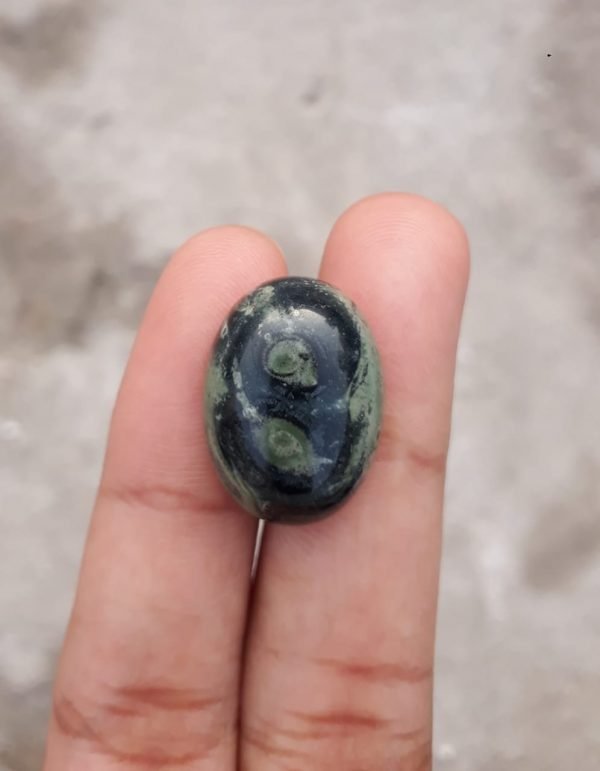 تم قطع هذا الكابوشون الفريد من نوعه من يشب كامبابا الفاخر، وهو نوع من اليشب ذو نمط مميز يشبه جلد التمساح. انها تأتي من المنطقة الأفريقية.