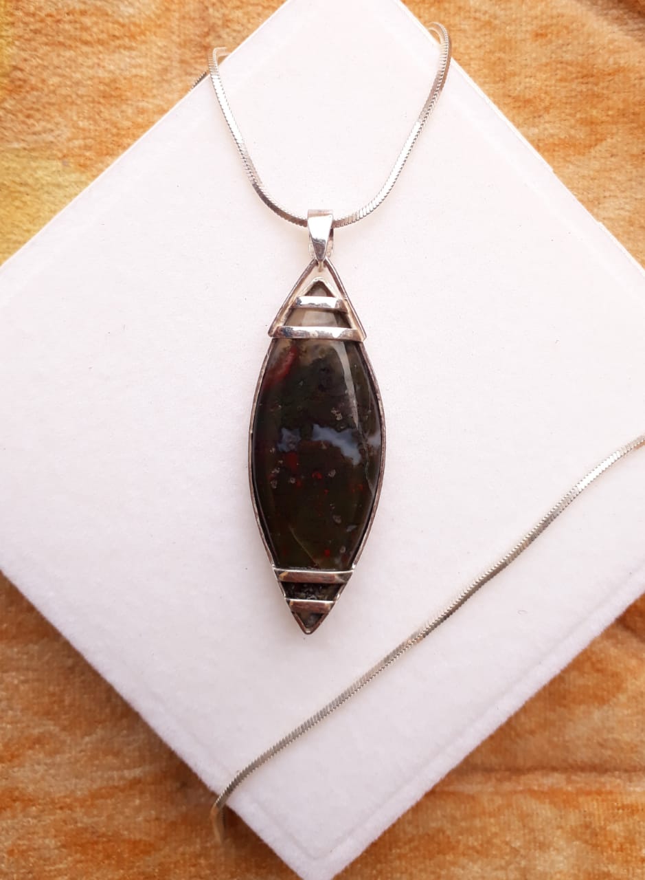 هذه القلادة مصنوعة من عقيق الشجري الإندونيسي الأخضر (العقيق الطحلب)، المعروف بخصائصه العلاجية، بما في ذلك تقوية جهاز المناعة، وتقليل التوتر والقلق، والمساعدة في الشفاء العاطفي. تم تركيبه من الفضة الإيطالية للحصول على مظهر كلاسيكي وأنيق.