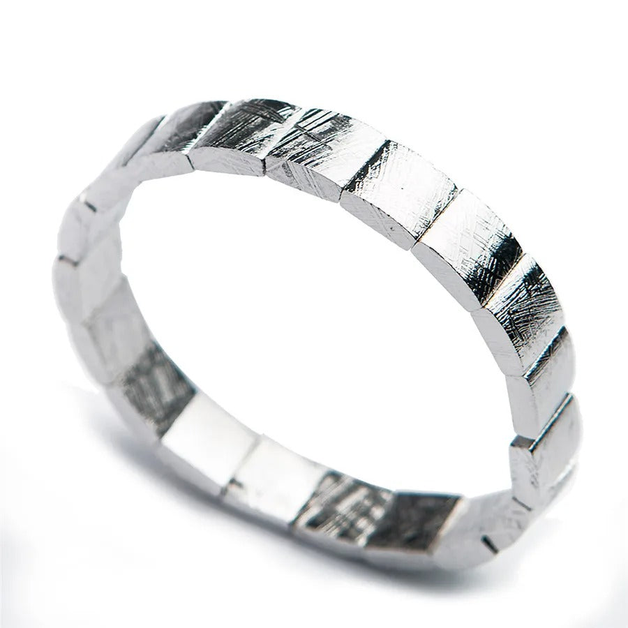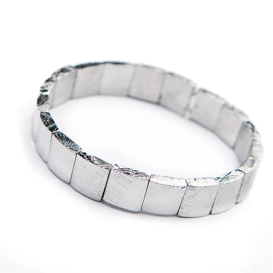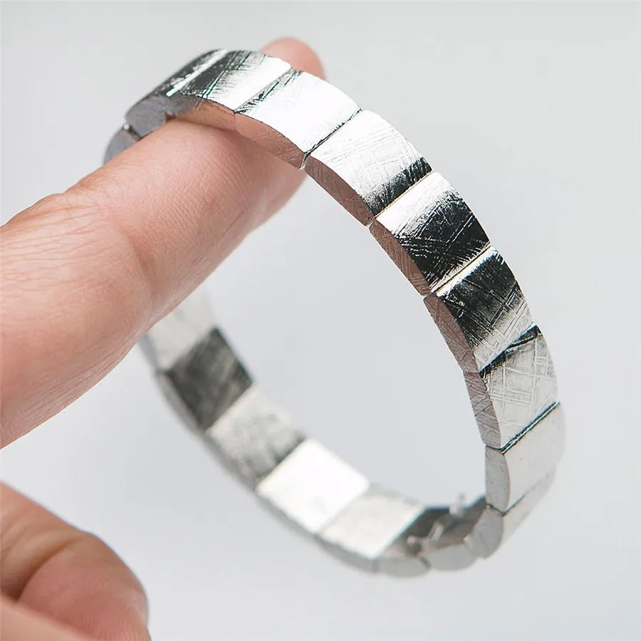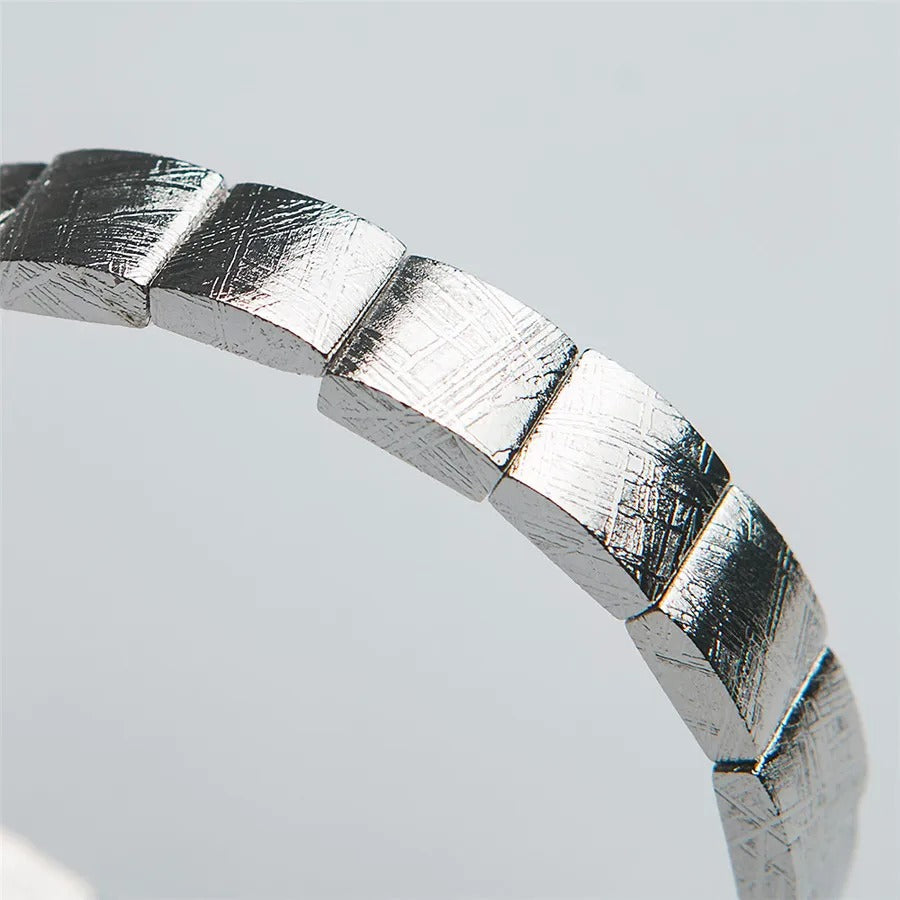 سيضيف هذا السوار المصنوع من حجر النيزك الحديدي الطبيعي لمسة فريدة وجميلة لأي نمط. تم تصنيع الحجر الكريم من نيزك جيبيون الحديدي الحقيقي، والذي يقدر عمره بـ 4 مليارات سنة. استمتع بجمال لا مثيل له لملمسه الريفي، الموجود فقط في نيزك حقيقي. مقاس السوار 11 ملم × 11 ملم، مثالي لأي حجم معصم.