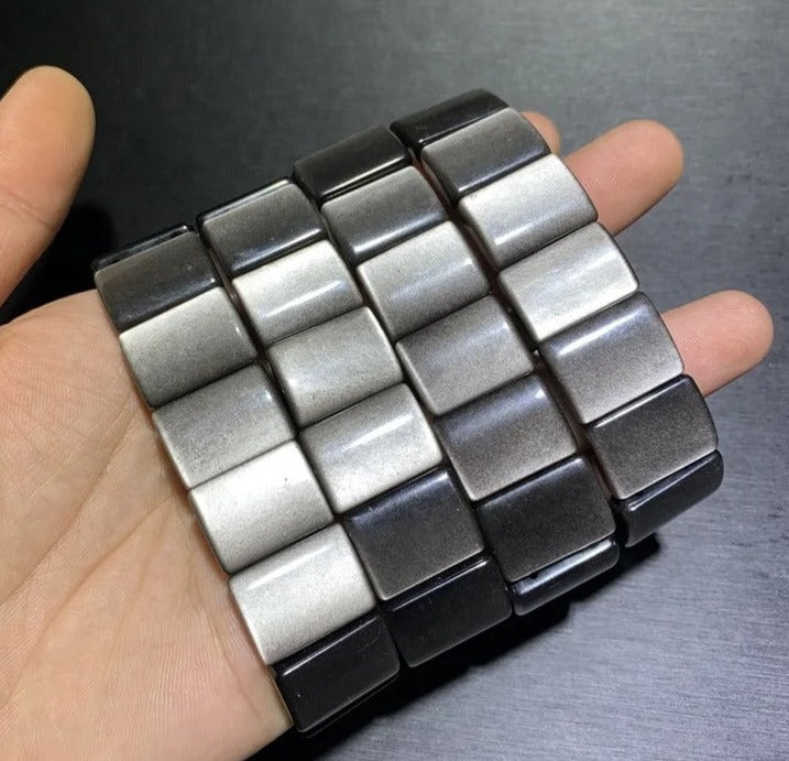 هذا السوار المصنوع من حجر السج الفضي الطبيعي للنساء مثالي للارتداء اليومي، بمقاسات متاحة من 7 إلى 12.5 ملم. تم نحت كل سوار من حجر السج الطبيعي، وهو زجاج بركاني ناعم الملمس. يعد تصميمه ذو اللون الفضي مثاليًا لإضافة لمسة رقيقة من الرقي إلى أي مجموعة.